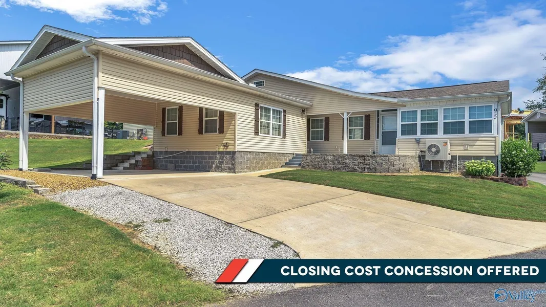 Closing Cost Concession Offered. Built for committed RV owners, this Blue Heron RV Resort property offers a 15'x40' RV bay with 13'8" clearance, full hookups, and a wide corner-lot approach that makes parking most RVs easier than many sites in the resort. In addition to the RV bay, the property includes a dedicated two-car carport for everyday vehicle parking. Inside, the home features a combined kitchen and living area designed for efficient, functional use, with a heated and cooled sunroom serving as additional flexible space. The layout prioritizes low maintenance, with lawn care, water, and sewer included. Resort amenities nearby, along with Guntersville City Harbor and public boat ramps.