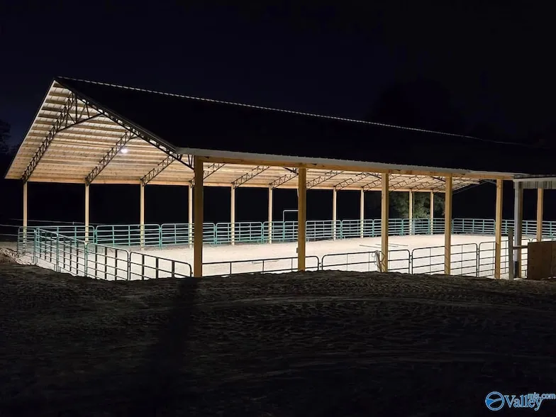 This fully operating, 10-acre horse farm is at a serene, dead-end setting. This 1,244 sq. ft. home features 3 bedrooms and 2 full baths. Recently refreshed with new interior paint, it has durable LVP flooring throughout and elegant granite countertops. The property features: a 7-Stall Barn, a 24x12 tack room, and a dedicated wash rack with hot and cold water. A covered 130x60 arena is fully equipped with power and water. The acreage is fenced and cross-fenced, including four pastures with solar-paneled hot wire and three sections with webbed fencing and lean-tos for shelter. There's also two ponds (one man-made and one spring-fed) and a creek running along the property edge.