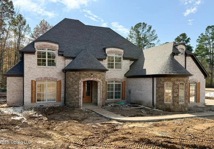 NEW HOME UNDER CONSTRUCTION ~ IMPRESSIVE French Country home on 1.57 acre lot., great location and no city taxes. This plan offers 3,100 s. f. with (5) Bedrooms (including bonus), (3) Baths (One is a Jack-and-Jill) and is a split/open floor plan. On the main level you have the primary bedroom with salon bath, second bedroom, another full bathroom, family room, breakfast room, formal dining, laundry room, HUGE foyer. Upstairs, you have (3) bedrooms (or 2 plus a media room) plus a Jack-and-Jill bathroom. The exterior of the house boasts sophistication with its beautiful, rounded turrets, brick and stone accents. If the curb appeal doesn't get you, the interior will! Home offers a catwalk looking down into the main living area and foyer, plus a custom made, curved staircase, adding an even greater prestigious look! Other interior ''wows'' include walk thru shower, rich granites, wood floorings, bull nose edging, ornate custom ceilings and custom fireplace and with built-ins in the great room. So many unique and beautiful features to this home... it is a must see! The kitchen offers custom cabinets, granite, SS appliances, gas range, double ovens, breakfast bar & room, SS appliances. The Primary Bedroom offers tray ceiling, wood flooring, salon bathroom with ceramic tile, soaker tub, walk through shower, granite/double vanity and large walk-in closet. Other home features include (3) car garage, crown molding, covered patio & front porch, tankless water heaters, wood tread on stairs, wrought iron railing, gutters, security alarm, security lights, and SO MUCH MORE!!! Come customize your home today!! Builders reserve the right to tweak all plans/colors/elevation as builders try to make all homes unique. Photos are of this plan previously built. Est. completion Jan 2026.