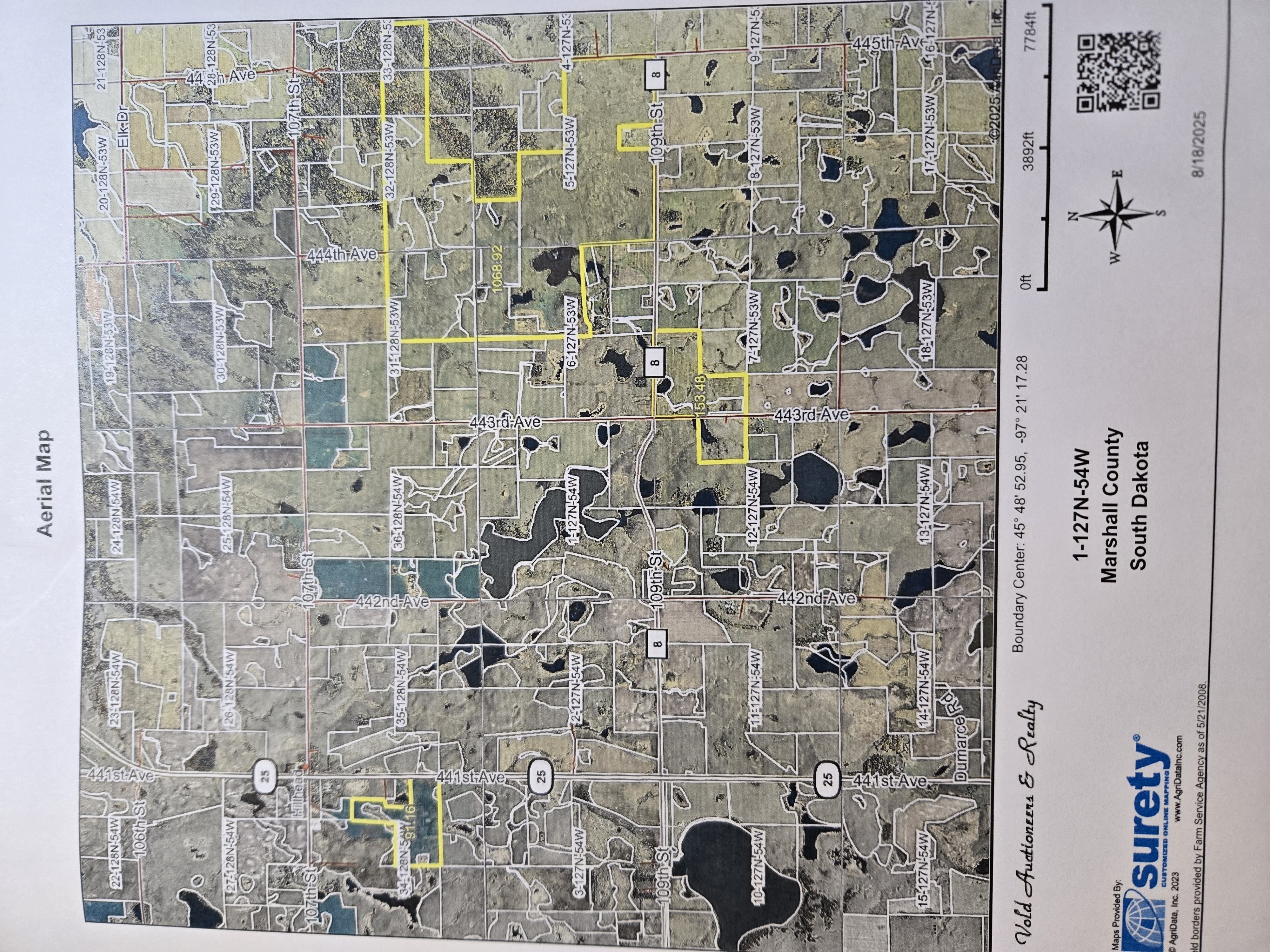 McKinley Township: S1/2NW1/4, S1/2 Exc. SW1/4SW1/4SE1/4 and Gov't Lot 4 (NW1/4NW1/4) in S5; Gov't Lot 2 (NW1/4NE1/4), S1/2NE1/4, Lot 1 (NE1/4NE1/4), N1/2SE1/4 and SE1/4SE1/4 of S6; Gov't Lot 1 & 2 and NE1/4NW1/4 in S7-T127N-R53W. Veblen Township: SE1/4 of S31; NW1/4SE1/4, SW1/4 and NE1/4SE1/4 of S32-T128N-R53W, and NW1/4SW1/4 of S33-T128N-R53W. DuMarce Township: SE1/4NE1/4 of S12-T127N-R54W. LaBelle Township: N1/2SE1/4 Ext Lot H-1; W1/2SE1/4NE1/4 of S34-T128N-R54W. All West of the 5th P.M. Marshall County, South Dakota