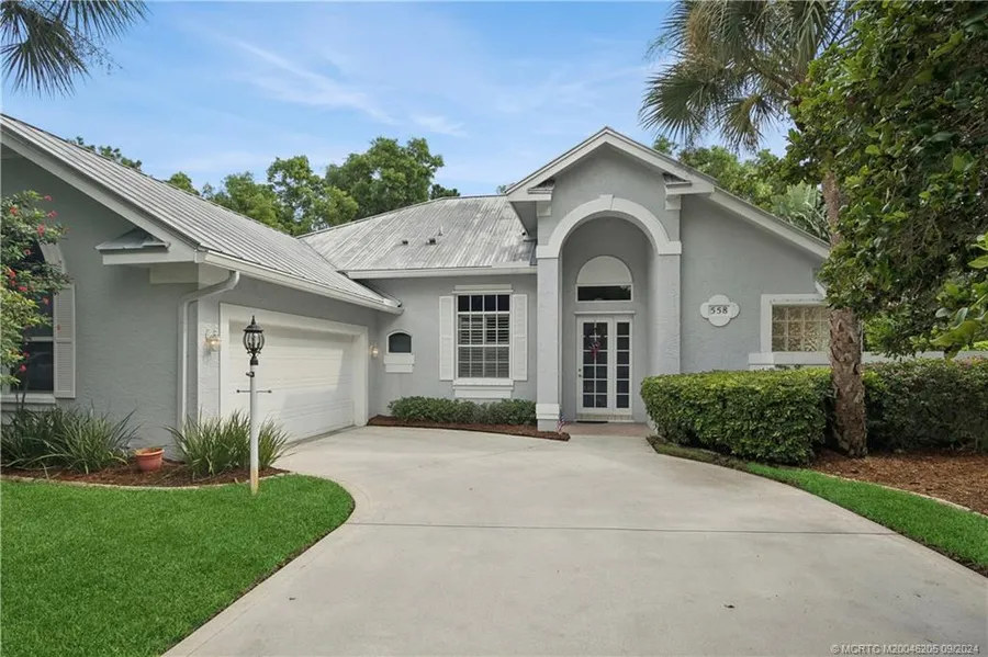 Welcome to SOUTHWOOD~ BEAUTIFUL 3 bedroom, 2 bath, CBS home with METAL ROOF. Enjoy the Florida lifestyle year-round on the delightful, screened-in paver patio with views of the lush, private preserve. IMPACT GLASS French doors exit to this space, from both the living room & kitchen. See stunning engineered hardwood floors in the living room, dining room & main bedroom. Gorgeous 20" white tile floors brighten the eat-in kitchen with its abundant white cabinetry and granite counter tops. The adjacent family room has bead board accented walls & built-ins for TV & storage. The spacious main bedroom has a tray ceiling. There are 2 walk-in closets. Main bath is filled with natural light & has separate tub & shower, dual sinks. 2 additional bedrooms can share a 2nd bathroom with both tub & shower. There is a utility room with stacked washer & dryer and plenty of extra storage. LOW HOA. Close to shops, restaurants, Downtown Stuart, the interstate and short ride to Stuart's pristine beaches.