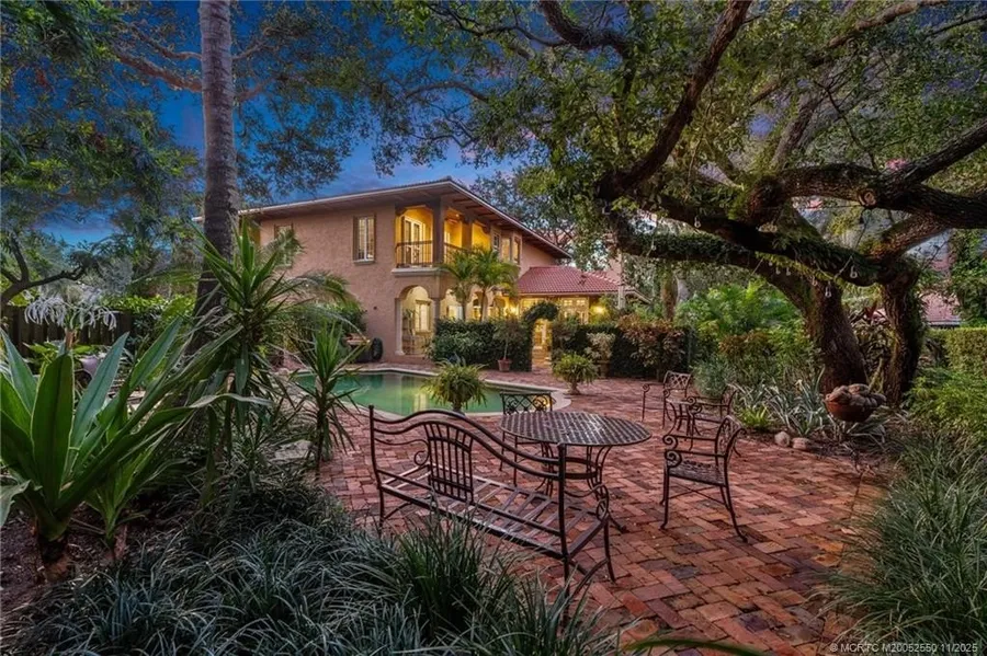 Superb Location! Experience timeless European charm in this elegant custom-built Sewalls Point residence nestled on a private cul-de-sac. Surrounded by lush gardens, the home offers privacy and sophistication with balconies, French doors, and rich wood or tile flooring throughout. The spacious kitchen and gathering area open to a serene paver courtyard with a fountain, perfect for entertaining. Features include a NEW 2025 roof, wood-burning fireplace with custom cabinetry, transom windows, and exquisite trim work. Enjoy the ultimate in relaxation by the pool, whether you're taking a refreshing swim or unwinding on the paver patio surrounded by tranquil garden views. You'll love to call this Home!