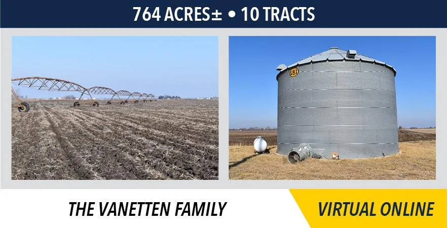 The VanEtten real estate will be sold on a price per acre basis, based on the surveyed acres. Tracts 1 - 6 will be offered through the marketing method of Buyers Choice, whereas the high bidder can elect any individual tract or tracts (in any order) for their high bid. If the high bidder does not elect all the offered tracts, then the remaining tract(s) will continue to be offered Buyers Choice until all 6 tracts have been elected. We will then offer Tracts 7, 8 and 9 as Buyers Choice, and then sell Tract 10 individually. The tracts will not be offered together or in any combination at the conclusion of the auction.