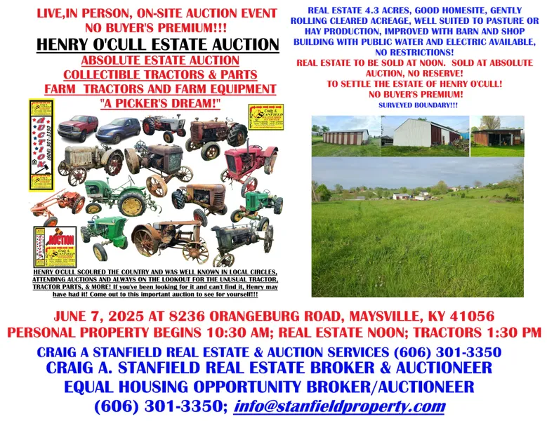 AUCTION CONDUCTED BY CRAIG A. STANFIELD REAL ESTATE & AUCTION SERVICES, CRAIG A. STANFIELD REAL ESTATE BROKER & AUCTIONEER, 2126 W. KY 10, TOLLESBORO, KY 41189, PHONE (606) 301-3350. CRAIG A. STANFIELD - LICENSED IN THE REAL ESTATE & AUCTION TRADES FOR MORE THAN 40 YEARS (SINCE 1984!). EQUAL HOUSING OPPORTUNITY REAL ESTATE BROKER & AUCTIONEER