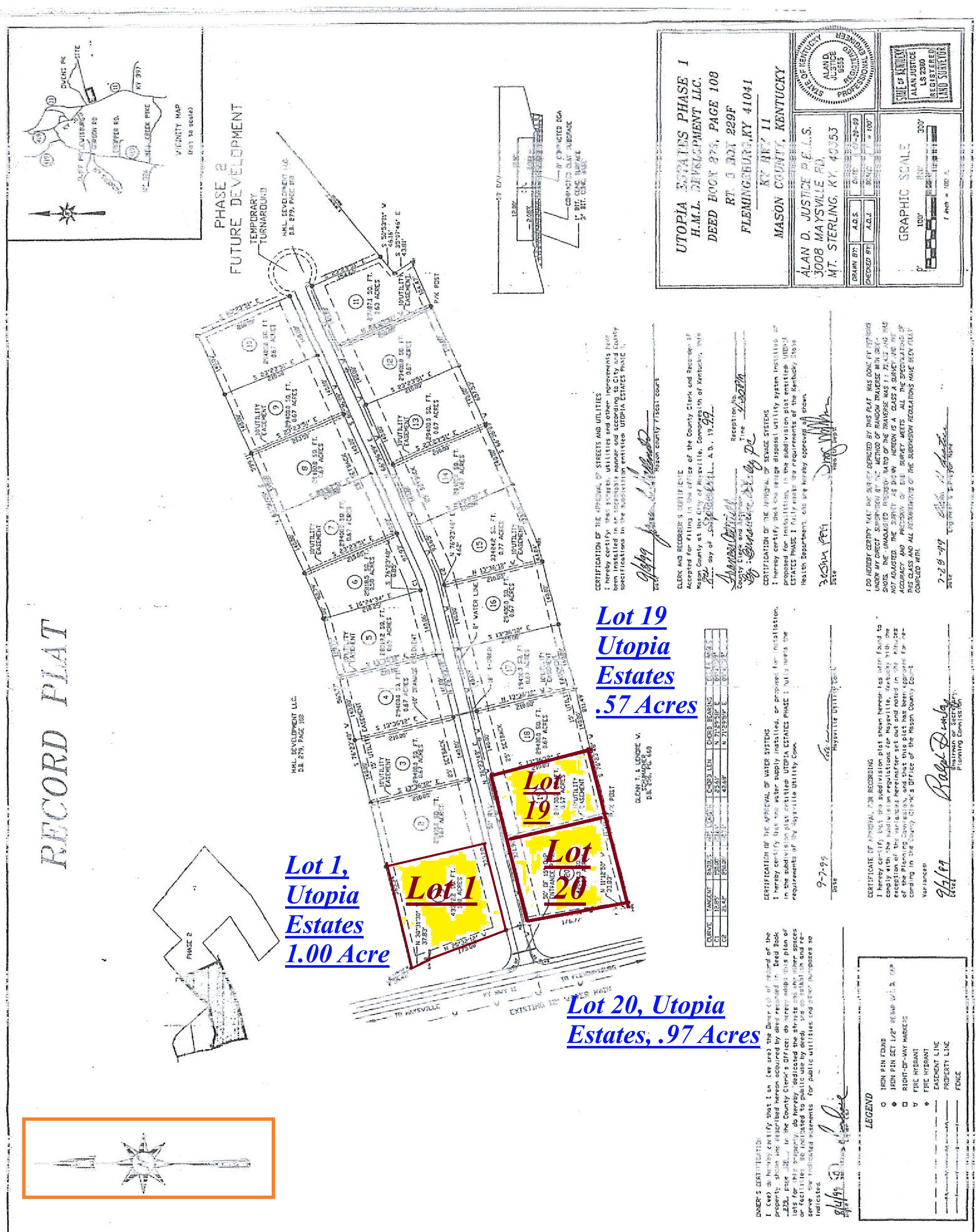 Mason Co., KY 1.5 Acres, 2 Adjoining Building Lots, Utopia Estates - Lots 19 and 20 of Utopia Estates. Lot 20 consists of a .97 acre building lot and Lot 19 consists of a .57 acre building lot, adjoining, the first two lots on the right entering from KY 11, subject to the Restrictions of Utopia Estates (1500 sq. ft. minimum home size), conveniently located just outside of Maysville but within an easy commute of Maysville's shops and employment centers, and priced at JUST $14,000!!!