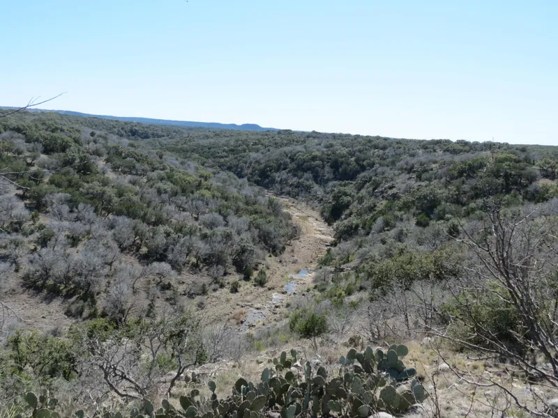 The terrain varies from rolling hills with rich sandy loam soils graduating to much more rugged terrain characterized by Rocky Creek, a deep canyon with sheer bluffs and rocky yet fertile soils. Rocky Creek is a seasonal creek, with intermittent holes of water and runs the length of the ranch (south to north) along the eastern side of the ranch. Views from the higher elevations and along the upper canyon are spectacular. Tree and brush cover is moderate to heavy, with cedar, mesquite, live oak, persimmon, and a good turf of native grasses as well as prickly pear, agarita and catclaw.