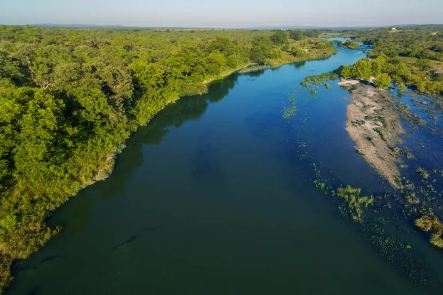 LAND: LRJ is an imperfect rectangle that is slightly narrower on the north end than the south along the river, being about 900 1,000 feet wide at the most. The wooded parcel is mostly native rangeland of mixed oak/mesquite, and falls from a peak in the NW corner gently over 100 to the banks of the river. Distant views are had from the northern portion, where a seasonal stock tank holds water in wet times.