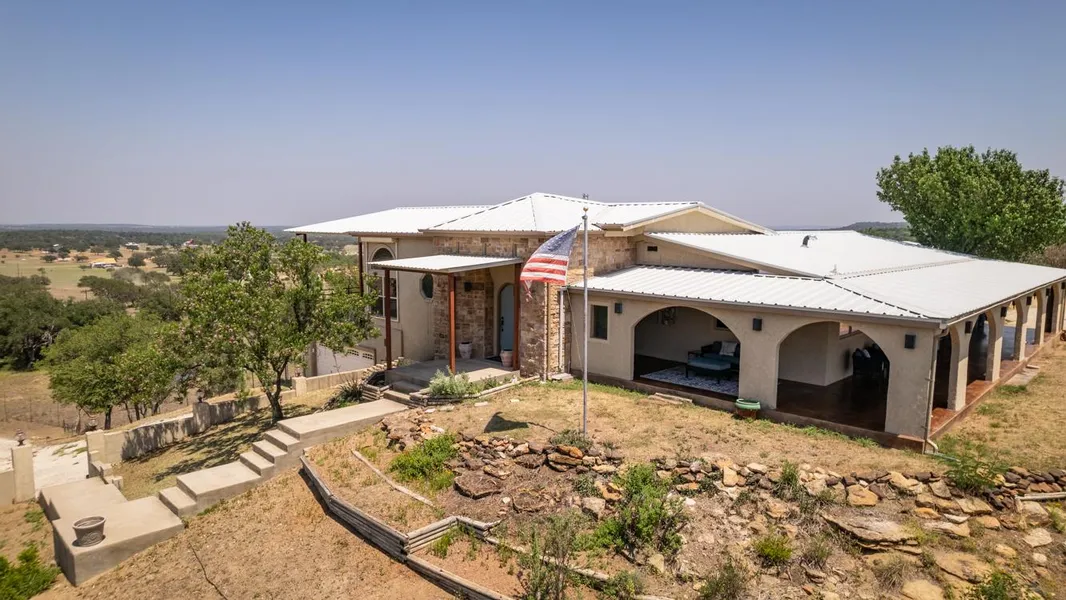 Located approximately 3 miles south of Mason on RR 2389 and less that two miles to the Llano and James River crossing. An owned private drive leads up to a stunning hilltop featuring a stucco & stone 2 bedroom , 2 bath home with custom kitchen, commercial appliances plus large utility/rec/flex room. An attached one bed/one bath/kitchenette guest apartment gives ample room for guest or possible BnB. The huge covered wrap-around porch and upstairs deck perched high on the hill with irresistible scenery and native landscape all around will leave you in awe.