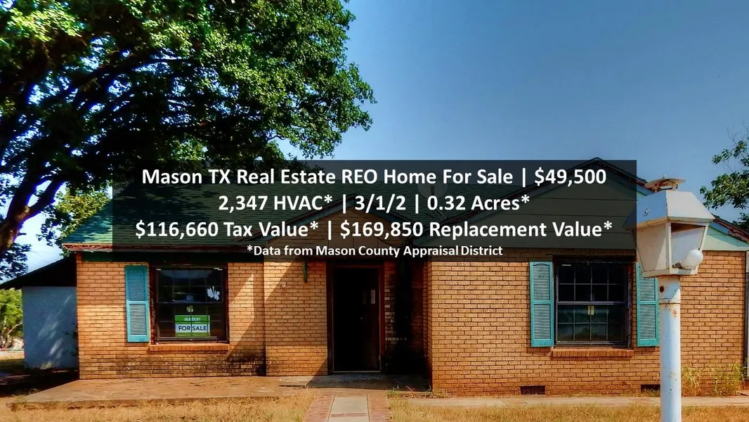 Texas Hill Country REO in Mason. 2,347 SF HVAC 3 bedroom, 1 bath, 2 car garage, brick home. 0.32 acre corner lot with very large trees and big back yard. Priced at 42% of tax value and 29% of replacement value per County Appraisal District data. All 3 schools within 0.6 MI with 8 to 10 Greatschools ratings. Non-traditional REO Census Block Group demographics: $195,000 AVG home values, $84,000 AVG household incomes, $767,000 AVG net worth. Very low crime index. 0.7 MI to downtown US-87 at TX-29.