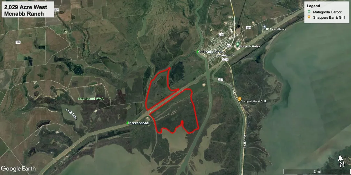 2,029 +/- ACRES WEST OF COLORADO RIVER AND THE ORIGINAL TOWNSITE OF MATAGORDA, TX. THIS IS PART OF THE ORIGINAL STEPHEN F. AUSTIN LAND GRANT BEFORE TEXAS BECAME A STATE. THE INTRACOASTAL CANAL GOES THROUGH THE PROPERTY FROM EAST TO WEST, WITH THIS RANCH ON BOTH SIDES, AND FRONTING WEST MATAGORDA BAY, AS WELL. THIS IS A SPORTSMAN'S PARADISE FOR HUNTING AND SALTWATER FISHING.
