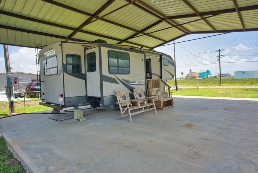 RV INCLUDED with This GEM of a waterfront property. This coastal getaway in Sargent, Texas is what you have been looking for! This turnkey RV/Residential lot is covered by a RV cover and comes with great size shed for any storage needs you may have as well as a nice size concrete pad that has a concrete walkway to its own dock and cleaning station with custom chairs. This property is only moments away from the ICW as well as Sargent Beach. The RV is a spacious Winnebago/Voyage with a Bedroom, full bathroom, kitchen, living area to relax and enjoy while watching tv. Sargent also offers a variety of restaurants and food trucks as well as a local Dollar General. Schedule your showing today before it is gone!!!