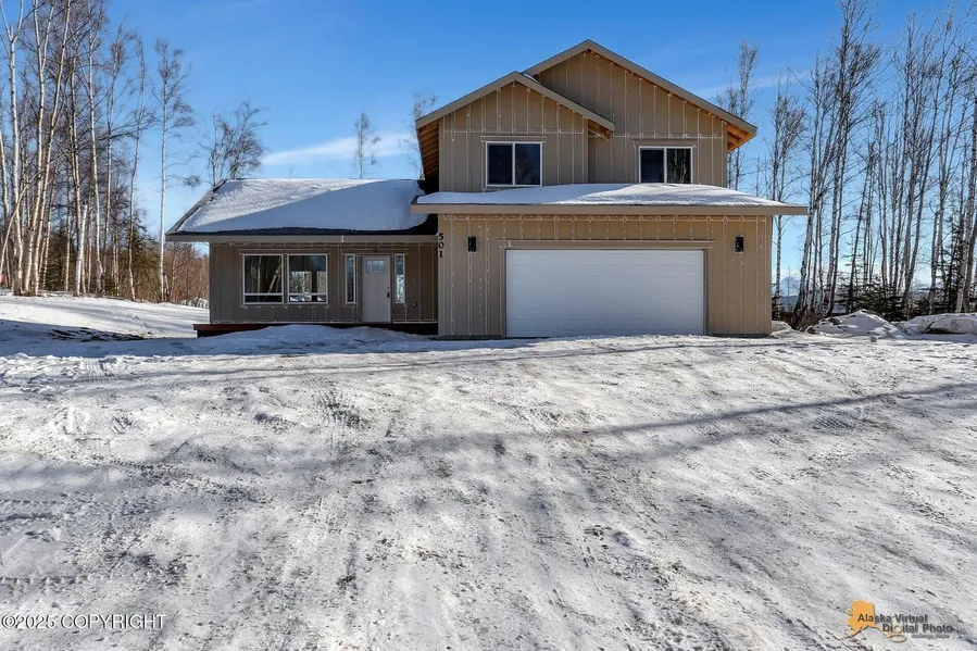 Beautiful 4-bedroom home just 7 minutes from downtown Wasilla-one of the few centrally located options on the market! This efficient layout offers versatility with a bedroom and full bathroom on the first floor, perfect as a convenient guest room or second master suite or a home office. Exterior features include board-and-batten siding, a covered entry porch, a covered back deck, and a paved driveway for great curb appeal. Inside, you'll find painted maple cabinets (light gray color), a modern backsplash, quartz countertops, a custom coffered ceiling in the master bedroom, a tiled master shower/soaker tub, and durable LVP flooring throughout the first floor. There's still time to personalize your finishes, including exterior colors, tile, lighting, and countertops. Estimated completion: 90-120 days. Photos similar and may include upgrades not included in this home.