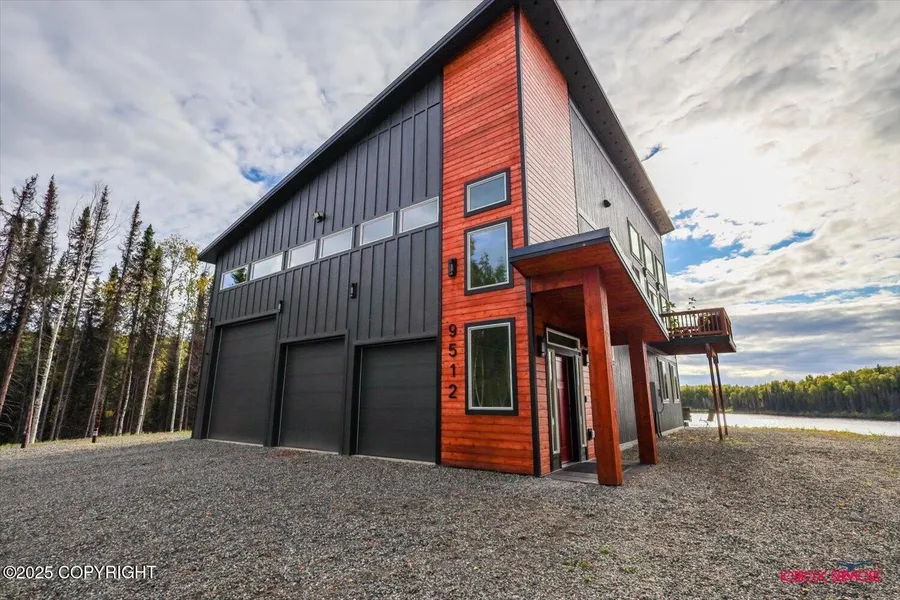 Modern lakeside shop-home on 3 quiet, private lakefront acres with unobstructed views of Mt. Susitna (Sleeping Lady) over Suncrest Lake. Southwest exposure and expansive windows flood the home with light and sunsets. A sleek exterior pairs with granite countertops and window sills, custom tiled showers, and tongue-and-groove accents inside and out for a sharp, contemporary finish. Serious shop space! 2,000 SF of epoxied garage floor with two 8-ft doors plus 9-ft and 12-ft doors. Ideal for RVs, toys, and projects. Built for efficiency, with 2-inch-thick garage doors and triple-pane windows delivering roughly double the insulating R-value of standard assemblies + radiant in-floor heat. You'll be cozy from head to toziea on the coldest Alaska days! Smart upgrades include a wet-bar rough-in, hot-tub outlet, generator transfer switch, and a basketball hoop. Outside, step onto your floating do...