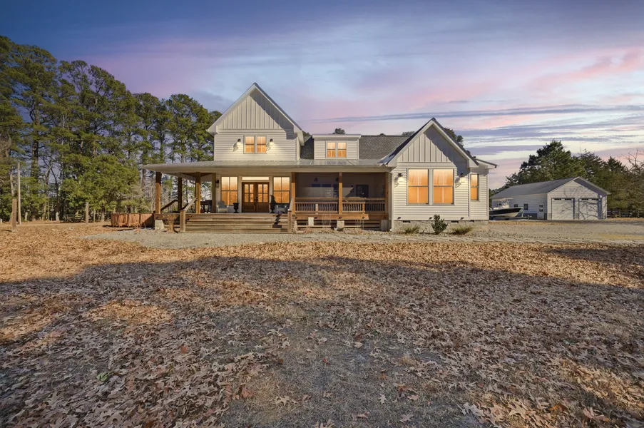 Custom-built farmhouse on Machem's Creek. Water views from every window. Custom kitchen, with a Frigidaire Professional grade refrigerator, custom cabinets with deep granite countertops, induction cooking, double wall oven, microwave drawer, and a 10 foot butcher block island with an open floor plan to the living & dining room, this home is great for entertaining on the river. Vaulted ceiling, first-floor bedroom with fireplace, walk-in closet, and bath complete with double vanity, and a soaking tub. The laundry room offers deep utility sink & pantry space. Full guest bath downstairs is great for guests and offers a full shower. Gorgeous hardwood floors throughout the first floor and all bathrooms, the side entrance offers a beautiful brick walkway. Upstairs offers two additional bedrooms and a large office. Hook up for washer & dryer. The front porch offers 500 sq ft of space with a met...