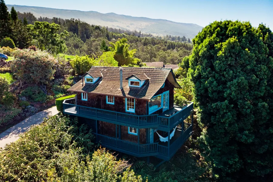 Country cottage meets upper Kula on this gated, fenced and manicured half-acre of land with stunning mountain views, succulent gardens, fruit orchard and terraced spaces where quiet contemplative moments abound. Curl up next to the fire with a cup of tea, stretch and breathe in the loft, or warm your toes in the morning sunshine while enjoying the birdsong. Inside, the soaring ceilings exhibit custom craftmanship, adorned with stained-glass touches while mid-century French windows fill your living spaces with natural light and vignette views of glorious Kula.