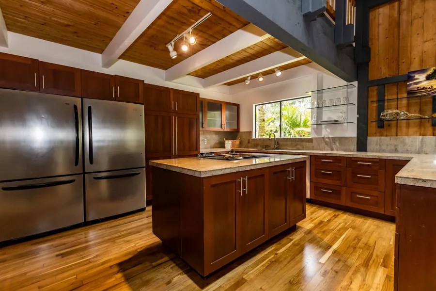 North Shore Surfer's Paradise...less than 10 minutes to Ho'okipa Beach and an overabundance of storage for all of your watercraft! There is plenty of parking and a peaceful, tropical setting. This property sits at the end of a private road and boasts over 5 usable acres. The main home has vaulted ceilings, large wrap around deck and freshly redone hardwood floors. There is an open concept, custom kitchen to prepare your meals while enjoying the lush scenery and sounds of nature. The floor plan offers many uses for you and your guests. One of the bedrooms and baths has a separate lock-off entrance or mother-in-law suite. There are lots of work spaces here and a separate 'utility shed' with many options. There is also a bonus "Jungle Hut" which is a must-see. Close to beaches, hikes, grocery, restaurants and a short 30 minute drive to the main town of Kahului. Come and experience the magic of Ha'iku's easy country style of living.