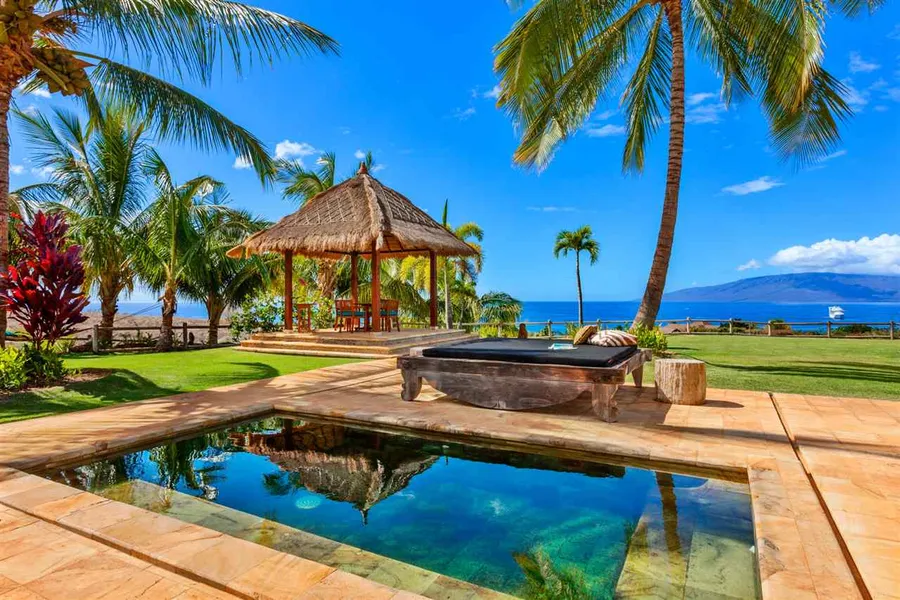 Located in the premier gated community of Pu'unoa Estates, overlooking Lahaina, 56 Wili Okai features 6 acres of expansive ocean, island, and sunset views in the perfect climate of West Maui. It is one of 24 exclusive estate properties with a 5-acre minimum size, zoned to permit a main house of any size, as well as a guest cottage of 1000 sq ft, and a barn. The perfect location to build your dream estate. This exotic Bali-style retreat exudes tropical island living. With pocket doors opening from the great room to over 2,700 square feet of spacious covered lanais, seamless indoor-outdoor living and entertaining can be experienced all year round. Enjoy views of Lanai and Molokai, West Maui mountains, year-round sunsets, and whale watching from this luxury villa and its pool, outdoor shower, and gardens. Details include finishes and furnishings from Java and Bali, custom cabinetry, and rec...