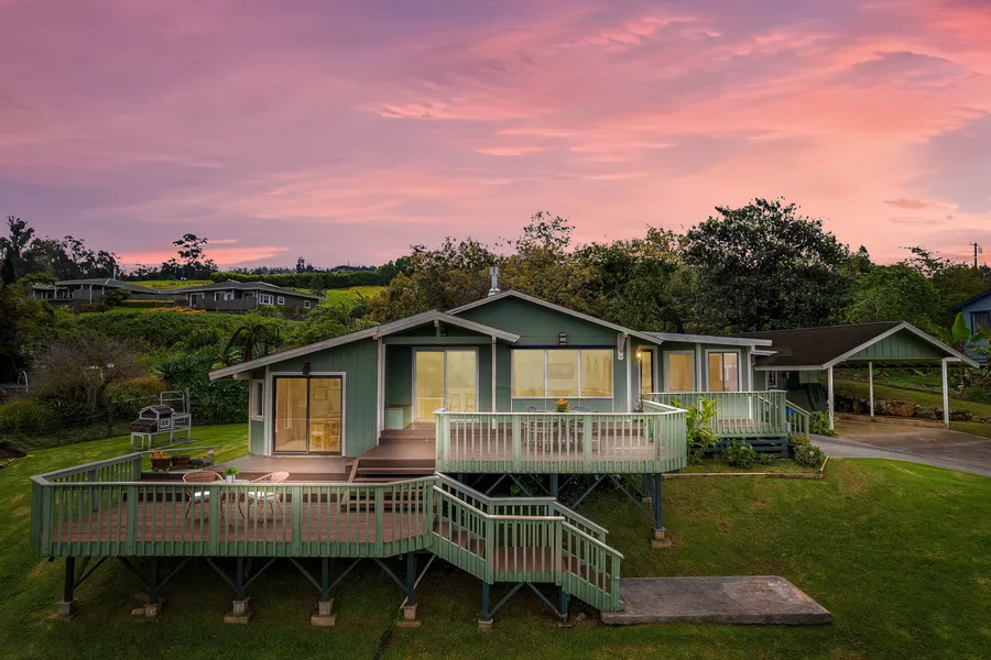 First time on the market (in 47 years, but who is counting?). This home & cottage, located in the “golden zone” of Kula has expansive views, ample decking to take in the views and abundant natural light inside. Evenings are graced with sunsets then; the Haleakala downslopes bring the crisp and cool air - great for sleeping! Mornings are filled with the sounds of birdsong and the sunrise at your back. The home mixes some of its nostalgic 1972 charm; original, refurbished oak flooring with updated modern convenience like the Jotul fireplace and Caesar stone counters with glass tile backsplash. Custom cabinetry, and stone are featured in the primary bathroom with an egress window to the outdoor bathtub where you can soak and catch the stars from the dark of night. The cottage features its own deck, bay windows in the bedroom, hardwood flooring and a woodburning stove.