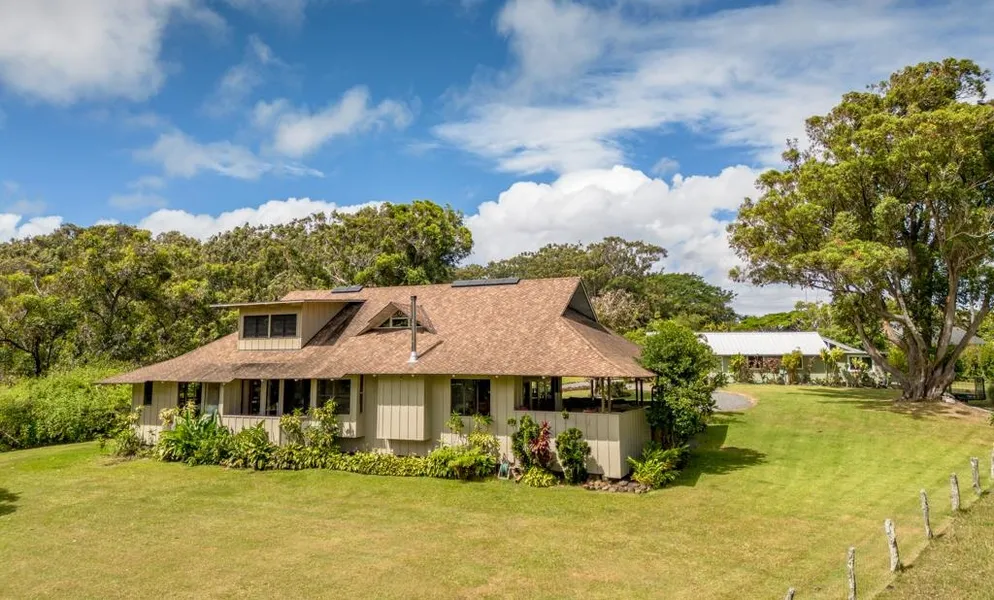 This remarkable agricultural estate has everything you want on a small farm in Haiku! The main home is an architecturally designed craftsman built home, stylistically its a blend of mid-century modern and contemporary. It has a huge roof that shelters large lanais that wrap around two sides of the house, this provides for indoor-outdoor living much of the year. The lanais are wonderful open vaulted spaces ideal for entertaining or just chilling, and they almost double the livable size of the home. The outdoor space flows into the Great Room with its teak floors and vaulted ceilings. The Great Room has a beautiful fireplace, a cozy reading nook, kitchen, and ceiling dormers that have stained glass features allowing natural light to flow in which highlights the richness of the teak floors and other wood accents. The bedrooms, laundry and mudroom are down the hall leading to the other end o...