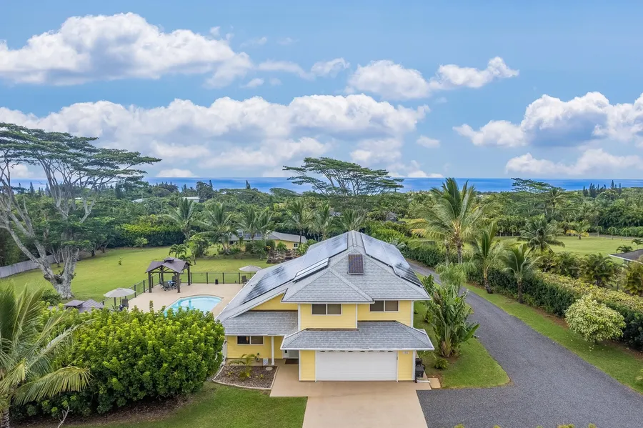 This tropical paradise is a one of a kind home located on Maui's renowned North Shore. Known for its tropical greenery, frequent morning rain showers keep this area lush and blooming. The home, located on a flag lot, boasts panoramic ocean views, exotic fruit trees, a cascading waterfall, groomed gardens, heated swimming pool and much more. Embrace the laid-back lifestyle that Maui is famous for on this serene and secluded paradise in Haiku. A short walk will bring you to Jaws, a famous surf spot known for its colossal waves and you are only 3 miles from Twin Falls. Incredible panoramas of the sea can be taken in from the living room, dining room, kitchen, master bedroom, and pool. Wake up to a peaceful morning taking in the ocean view while sipping coffee on your private lanai off the master bedroom. Spend time with guests on the spacious lanai while enjoying the ocean view and the amazing array of colors as the sun sets. There are 2-12 x 12 gazebos outfitted with fans and electricity located on the spacious pool deck. The Ohana located on the North end of the property, has been renovated with upgraded fixtures, lighting, appliances, flooring, split air conditioners, and more. Enjoy the Maui breezes on the veranda off the living room. Both homes feature new solar systems, split AC units, and spacious garages, the sale includes a John Deere riding mower and 4x6 trailer. The Solar system at the main house has an automatic transfer switch system, when the grid goes down, there is still power. The Ohana house is offered fully furnished. The main house is offered partially furnished, for a complete list of upgrades please see attached documents. Property is graded for excellent drainage. Both solar systems are seller owned and electronically monitored.