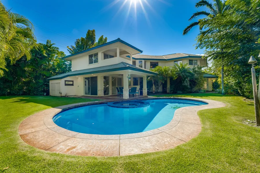 This large custom home in the sought after Wailea Pualani gated community is at the end of a cul-de-sac on a quarter acre flag-lot providing seclusion and privacy. Boasting spacious living, privacy, and close proximity to Waileas finest beaches, shopping and dining. The main floor offers a large chefs kitchen, adjacent dining room and wet bar. An added bonus and rare offering is the private guest suite, office and bedroom with a separate private entrance. The upper level of this home boasts additional living area with a lanai, three large bedrooms, additional private lanais. The primary room includes his and her walk-in closets, a private lanai and a spacious ensuite with a walk-in shower and soaking tub. The beautiful landscaping creates a peaceful and private yard with a lush lawn, covered lanai, pool and hot tub. Call your favorite Realtor today for a private tour!