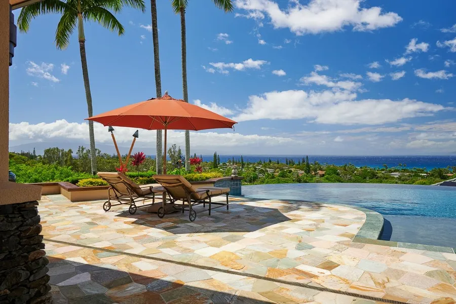 Located in Pineapple Hill Estates, Phase II, Kapalua Resorts prestigious gated community, this custom-built, single-level residence boasts panoramic ocean, sunset, and neighboring island views. With just under 5,000 square feet of living space on approximately half an acre of land, this estate offers seamless indoor/outdoor living and an abundance of privacy with its gated entrance and elevation. This well-designed floorplan features a tranquil foyer with water features leading into an expansive great room overlooking the infinity edge pool and spa. Located on the north wing is the primary suite, with a luxurious ensuite featuring a his and hers walk-in shower, vanities, and toilets, and a second bedroom that is currently being used as a home office. The south wing includes two additional guest suites, a generous storage room, and a large 3 car garage that also accommodates a golf cart. The kitchen opens up to the dining area that seamlessly expands to the outdoor dining area and built-in grill for effortless indoor/outdoor entertaining. Premium finishes include African Mahogany Wood, custom made cherry cabinets, travertine flooring, granite countertops, Control 4 and Lutron Home Automation System, built-in sound system throughout the home with surround sound in the master bedroom & living room area, and a full-sized attic space for ample storage above the garage with a dumb waiter elevator system. Additionally, the home is equipped with a 73-panel photovoltaic system, which is grandfathered into the Net Energy Metering Program. Additional amenities in the Pineapple Hill development include a Resident Manager, a Pavilion with a fabulous pool, entertainment area, catering kitchen, barbecues, and tennis courts. Kapalua Resort amenities include fabulous beaches, two world class golf courses, The Bay Course and The Plantation Course, as well as tennis facilities, hiking trails, luxury hotels and spa, fine dining, and a resort-wide shuttle. Furnishings negotiable.