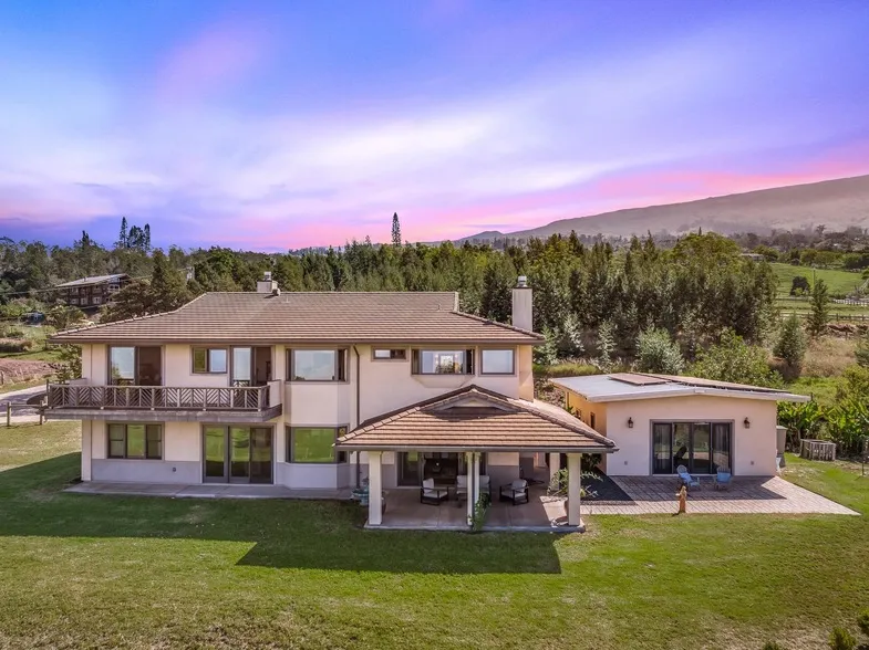 Welcome to your dream executive home nestled in the breathtaking climate of Kula, perched at a perfect 2,948' elevation. This custom-built masterpiece is not just a house; it's a sanctuary where stunning bi-coastal ocean views greet you each morning and panoramic sunrises and sunsets paint the sky each night. Imagine sipping your morning coffee while listening to the gentle rustling of nature, creating a serene backdrop for your day. As you step inside, you're welcomed by soaring ceilings and exquisite Sapele mahogany double entry doors that set the tone for luxury and elegance. The interior is a harmonious blend of style and comfort, featuring travertine floors in all bathrooms and smooth walls that enhance the feel of the space. Cozy up by one of the two fireplaces on cool evenings, or indulge your culinary passions in the gourmet kitchen equipped with a Thermador 6-burner gas range. The primary suite is a true retreat, boasting a lavish 6-foot soaking tub in the luxurious bath and an expansive walk-in closet complete with custom mahogany shelving. Every detail in this well-maintained, turn-key estate has been thoughtfully designed to cater to your lifestyle needs. The entire 2-acre property is securely fenced with a gated entry, offering privacy and peace of mind. With an owned, net-metered PV system and solar hot water, you can enjoy the benefits of low electric bills while embracing sustainable living in this exquisite home. The soil is the highest quality for organic farming, surrounded by persimmon farms. It is truly a "Goldilocks" location. This is not just a property; it's a lifestyle waiting for you to embrace. **Superb Seller Financing terms available.