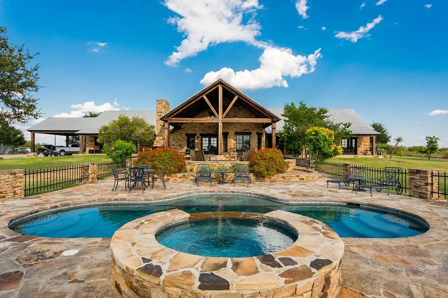 Improvements: The ranch improvements will impress even the most discerning buyers. The custom 6 bedroom 5 bathroom home is truly a work of art, built by the most talented craftsmen available. Comfortable without being overbearing, the finishes blend right into the natural landscape. Dry stacked sandstone, reclaimed timbers, and a standing seam metal roof envelope approximately 5,200 square feet of absolute luxury. The timber framed home was built with entertaining guests in mind, so the massive open living area leads to two wings with three master suites, three secondary bedrooms, an office, a bunkroom, upstairs loft, and oversized utility room This arrangement allows comfortable accommodations for up to 24 guests. The chef's dream kitchen, centered by a mesquite topped island, includes hand built cabinetry, stainless commercial appliances with 60" range, and gorgeous granite counter tops. The dining area boasts a custom made 15' long table with seating for 10. High end leather sofa and recliners surround the big screen TV and massive stone, wood burning fireplace and guests will enjoy the pool table, poker niche, and 12' natural mesquite bar with sink, ice maker, refrigerator, and keg tap. The massive reclaimed timbers, durable wood floors, intricate tile work, plaster walls, and Cantera stone accents are reminiscent of Spanish style haciendas in Mexico. Let the year round entertainment continue outside where you will find over 3,200 square feet of covered patios, porches, and parking areas. The main flagstone outside living area is cooled by a 12' ceiling fan constructed from an actual windmill. Just beyond the professionally built-in bbq pit and cooking area, kick up your boots around the flagstone fire pit or enjoy a relaxing swim in the pool or hot tub. Lush native landscape and mature shade trees surround the home, sitting high on a hill just above the 10 acre house lake and overlooking the entire ranch. Just a short walk away is the 4,800 square foot insulated shop with roll up doors to store all your ranch toys, machinery, tools, and equipment. Upstairs is a comfortable apartment, perfect for a live in ranch manager or overflow guests. Hunters will gather to celebrate at the game processing area which includes four hoists, a walk in cooler, stainless sinks and tables, as well as a covered dog kennel. And if there is any time left in the day, meet up at the lighted regulation skeet range complete with high and low houses and covered lounging area. The entire 3,250 acres is high fenced in excellent condition and there two water wells, one of which is utilized for the headquarters, supplying ample water to the home and water troughs. Miles of maintained roads meander throughout the acreage and dozens of senderos and food plots have been cut into the brush to capitalize on the hunting opportunities.