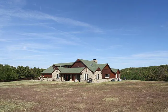 Gated executive Colorado lodge style home nestled at the foot of the Ozark Mountains. Wood and stone bring a natural beauty to this two-story residence. Exquisite open floor plan with impeccable attention to detail is around every corner. The rustic look is what really stands out. Dining area is adjacent to the kitchen to make it as formal or informal as you like. Kitchen, great room and dining are located together for easy entertaining options. Large double-sided stone fireplace can be enjoyed from the living area or the oversized covered patio in the backyard. Many custom built features make this property great for entertaining. Backyard has built in hot tub, in-ground pool and stone grill. Living room is adorned with cathedral ceilings and distressed wood beams giving the home a resort feeling. Window along the back of the great room and dining area bring two spaces together. Kitchen has custom built cabinets and oversized marble island with built in wine cooler and ice maker. All new built-in stainless steel appliances give the kitchen a crisp, clean look. The home also has an extremely large utility room with sink, counter space and plenty of storage. Rustic lodge interior with 3 bedrooms on the main floor, including the master suite which has french doors giving you access to the back patio and pool area. Lavish master bathroom with a Jacuzzi tub and separate shower, double sink, vanity lighting and a great view of the property. Large dressing area and his and her closet is located just off the master bathroom. On the second floor you will find the T.V. room or game room and the 4th bedroom as well. The property is professionally landscaped, has a security system and intercom system throughout. The ambiance of the home is the perfect blend of rustic elegance and country living. 60x50 insulated metal shop building with efficiency apartment and 2 horse stalls, tack room with large concrete apron out front. 50x40 metal barn designed currently for AI and handling of trophy deer breeding stock, including kitchen, AI lab room, feed room, storage, etc. Headquarters includes approx 26 acres for horse pasture and over 11 traps surround by 8 foot woven wire pens and alley ways to move deer throughout the breeding complex with automatic water system to each trap. Approx 4 miles of 8 foot woven wire pens constructed on farm. The farm as ideal environment for hunting with, rolling topography, heavy timber and only one side of property touching a county road with the remaining perimeter protected from public access. The farm has black top road access, road with security gated entrance. Home and improvements cannot be viewed from county road. Property is less than one hour from Tulsa Metroplex and a few minutes off 4 lane Highway 412. The nearest community for services is Locust Grove. To appreciate this property with all its features view our virtual tour under rural residential.