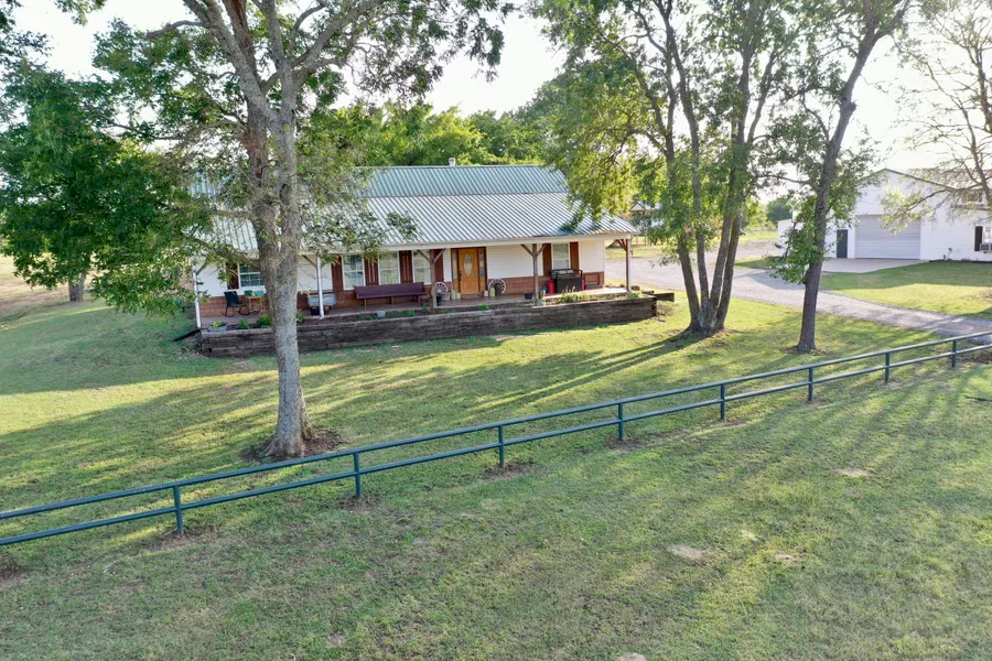 Piped entryway leads you down a 1/4 mile long driveway to this gorgeous farm styled home with its huge covered front porch. You are transported to the peace and quiet of the country with this 80 acre spread.