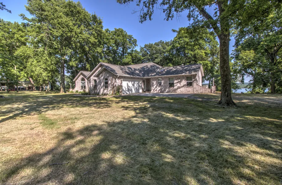 Awesome views of Lake Hudson from this site on approx. 2 acres. Unique plan that features 2 living areas each with own fireplace and master suites. One side has living with fireplace, bedroom, bath and other side has living with fireplace, dining room, kitchen and 2 bedrooms with bath. Utility in hall between, 2 car garage. One bedroom closet is a safe room and screened back porch across back of home. Concrete slab for seating outside and storage shed. New roof in 2021.