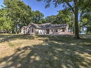 Awesome views of Lake Hudson from this site on approx. 2 acres. Unique plan that features 2 living areas each with own fireplace and master suites. One side has living with fireplace, bedroom, bath and other side has living with fireplace, dining room, kitchen and 2 bedrooms with bath. Utility in hall between, 2 car garage. One bedroom closet is a safe room and screened back porch across back of home. Concrete slab for seating outside and storage shed. New roof in 2021.