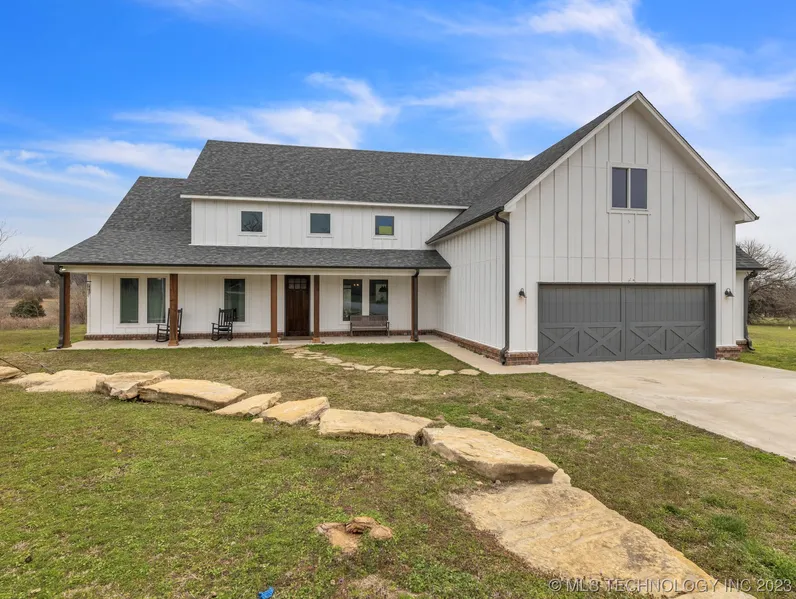 The homestead life awaits on these private 22 acres with mature trees and wet-weather creek in Pryor, OK. This beautiful modern farmhouse, built in 2018, includes a catalytic wood burning fireplace with posi-pressure to heat the whole home. The acreage is farm-ready (including barn with lean-to, corral and chute).The home is generator hookup ready. Additional room upstairs floored & ready to finish for 4th bed or game room. Includes 4X8 Safe room. With multiple porches for enjoying the beautiful outdoors or watching college football (wired for entertainment). High-end appliances and designer touches in Kitchen, Bathrooms and throughout! Large mudroom, huge master closet and walk-in pantry. Optional 4th bedroom/office. Under 10 minute drive to Mid-America Industrial Park, 45 minutes to Tulsa and a couple miles from Lake Hudson. Owner Agent