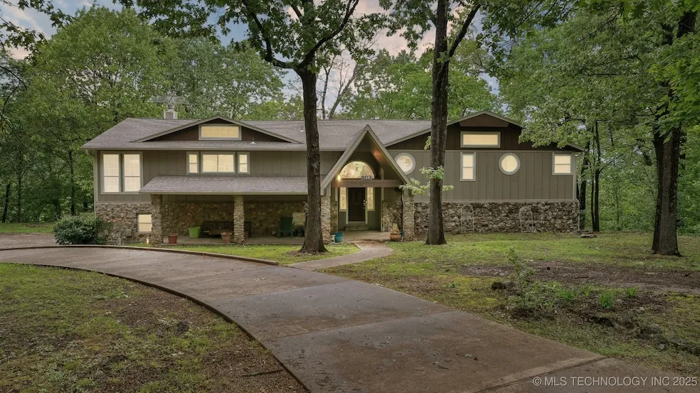 Nestled on a private wooded bluff overlooking Lake Hudson, this exceptional waterfront retreat offers tranquil seclusion and direct access om a dock approved cove. The home boasts panoramic views from nearly every room, especially the wall of arched windows in the great room and the spacious screened-in balcony-- perfect for enjoying sunrise coffee or sunset gatherings. The thoughtfully designed kitchen features custom oak cabinetry, ample counter space, double ovens, a gas cooktop island, and a large pantry. Natural light pours into the breakfast nook through picture windows, providing peaceful forest and lake views. Just off the kitchen, the open-concept living area includes a fireplace and built-in shelving, creating a cozy yet functional space. The wetbar with icemaker will add to the ease of entertaining family and friends for those long holiday weekends and special events. The oversized primary suite offers hardwood flooring, a rock fireplace, private deck access, a walk-in closet, dual vanities, a walk-in shower, and a jetted tub. Downstairs, the walk-out basement includes a second living area with a fireplace, full bath, two additional bedrooms, and flex spaces ideal for guest quarters, office, hobby room, or storm shelter. Three full garage bays and a circular drive provide ample parking and storage for lake toys and outdoor gear. There is also a small shed for all the yard tools and floaties that won't fit in the garage. Whether you're looking for a weekend getaway or a forever lake home , this one offers both peace and practical function in a wooded waterfront setting. It could be a great vacation rental as well since the seller is willing to leave all the furnishings currently in the property Located just minutes from Lake Hudson recreation areas, this is Oklahoma lake life at its best.