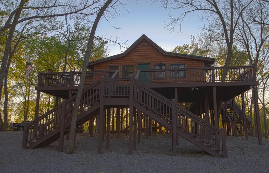 Continuing down the driveway, you will find the impressive, custom-built, elevated log cabin overlooking your own private cove. This fully furnished 1,500 square foot cabin has been immaculately constructed and the owner has not spared any expense to create an absolute gem. The rustic charm and details put into this 1 bedroom, 1 bath home is second to none. Along with the loft and multiple beds throughout the home, the new owners have the ability to sleep 8 comfortably. The wraparound porch allows for amazing views of your private cove, as well as the Grand River on the north side of the 8 acre food plot.