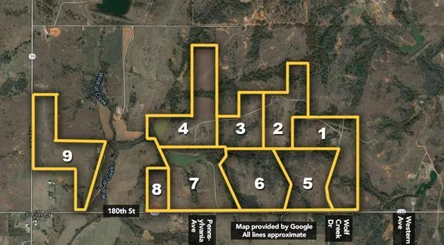 Auctions: 3:00 PM 12/1/2015 Nominal Opening Bid: $500/ac. 471+/- acres selling in 9 parcels in McClain County. Beautiful property with several building sites, a private lake, multiple ponds, rolling hills and native grass. Plenty of wildlife for hunting enthusiasts. Parcel 1: 67+/- Acres. Includes road overlooking the valley with some woods and the majority open pasture. Parcel 2: 48+/- Acres. Pond, open pasture, several homesites and some exterior fencing. Parcel 3: 38+/- Acres. Homesite with a mix of open pasture and wooded areas. Parcel 4: 66+/- Acres. Large ponds with multiple high points for homesites. Nice pasture land with some fencing. Parcel 5: 51+/- Acres. Homesite with access from 180th and easement road. Mix of pasture and wooded area. Parcel 6: 60+/- Acres. Gate off 180th, perfect for homesites with pasture and woods. Parcel 7: 68+/- Acres. Beautiful lake, wet weather cree...