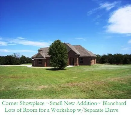 Price Reduced - $19,000! Exceptional Design - Great Location in Small New Addition Open great room, kitchen and dining areas accented by architectural elements and natural light make this home very entertaining and functional for family living. French doors lead to the covered patio and wooded views in the backyard. Home is located on a showplace corner lot. Large fourth bedroom upstairs could be bonus room, exercise room or study. Master suite has two walk-in closets, lots of windows, double vanities, whirlpool tub and separate tiled shower. Mother-in-law plan. Large guest bedrooms. Two dining areas or two living areas, whichever you prefer. Lots of ROOM for a WORKSHOP with its own driveway. Added construction features include: Extra wide baseboard Faux finishes Solid wood interior doors Fiberglass exterior doors Upgraded windows Manabloc water shut-off system Convenient location north of Blanchard only 20 minutes to OKC or Norman. 3 miles south of HE Bailey Spur on Hwy 76.