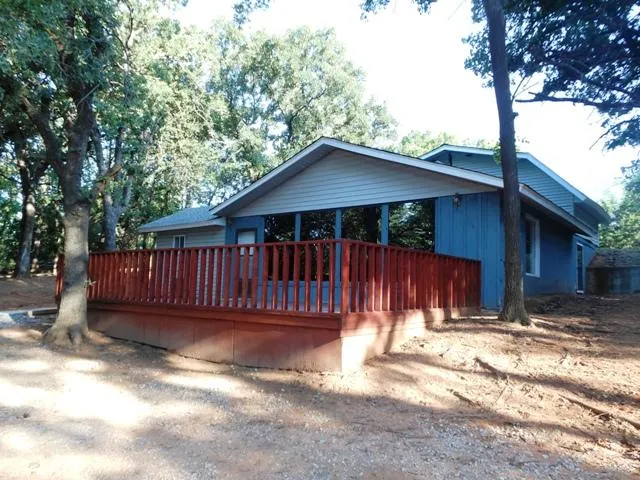 Hillside home tucked away in a secluded, wooded setting, close to town. Enjoy the views from open living/kitchen/dining area and expansive outdoor deck. Ceramic tile floor covers open living, kitchen and dining area. Master bedroom has large walk-in closet and bath. Two bedrooms upstairs. Unique property has great landscaping potential.