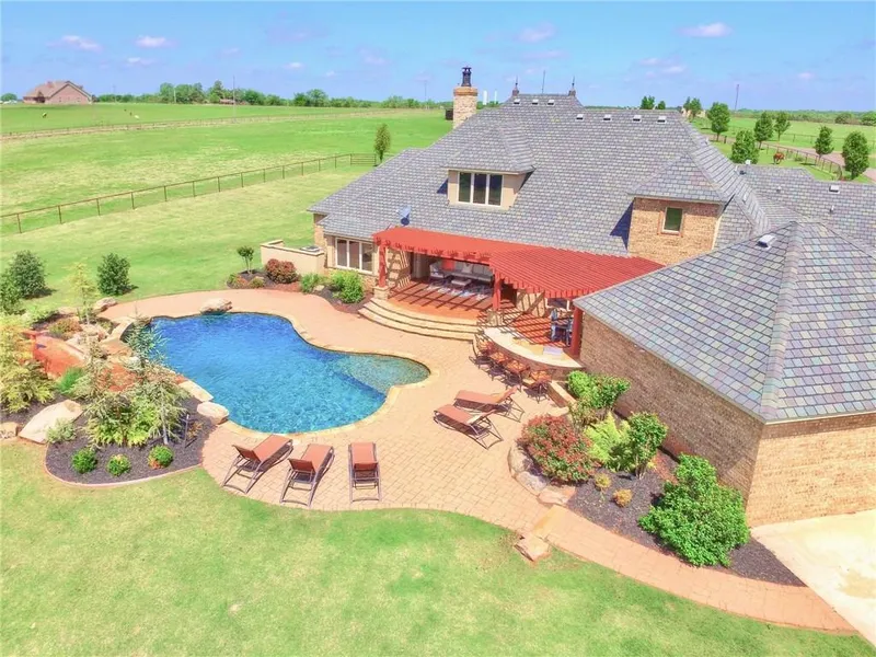 Stunning architectural detail starting with the custom gated driveway down to the glass barn doors. Enter this amazing home through the custom 12 ft metal doors into the grand entry. Photos simply cannot capture all the design elements from triple trey ceilings in the formal dinning, master & office to the wood beams in the living room. The kitchen is a chef's delight with double ovens, huge island, butler pantry and open concept. The master offers privacy with a spa master bath w/ his and her's closet, safe room, huge spa tub & walk-in shower. Each bedroom has its own private bath with architectural touches. Massive bonus/media room. Barn is 60 x 65 and set up for 8 - 10 stalls or could be used for car enthusiast. Outdoor living at its finest w/ custom outdoor kitchen, dining room and living area. Play in the Custom one of kind 30,000 gallon Copper Ion Pool w/water slide, sun deck & water fall.