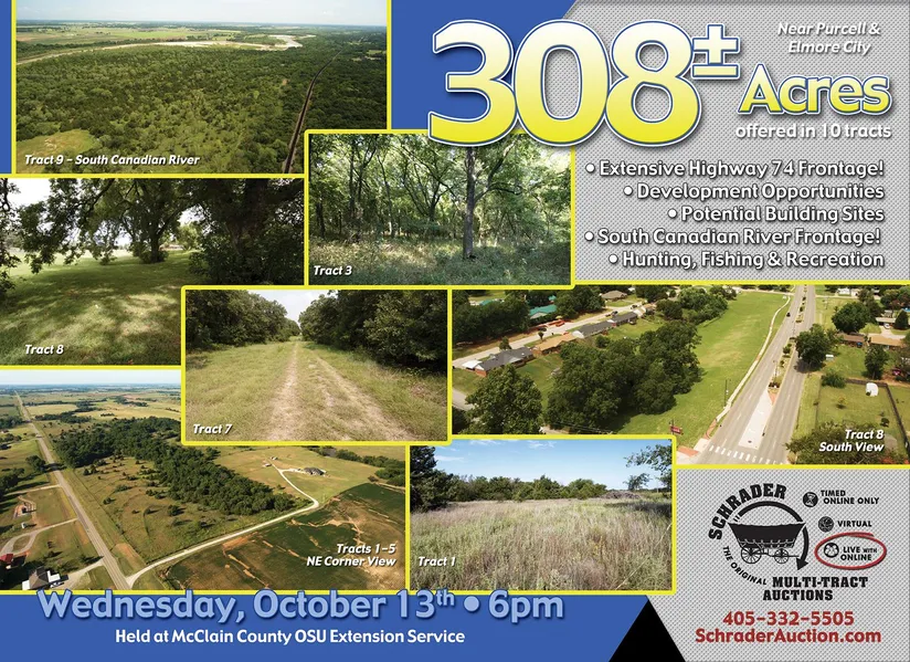 We are pleased to offer this unique portfolio of LAND holdings in McClain and Garvin Counties. This is a truly diverse offering of land, including: South Canadian River frontage land with outstanding recreational features, corner lots in Purcell along Green Ave (Hwy 74) with great development potential, Highway 74 frontage south of Purcell with excellent homesite potential and pasture/hunting land near Elmore City. The diversity of this offering creates an exciting opportunity for Buyers! Review the individual tract descriptions and property maps in detail to see the tract that best fits your needs!