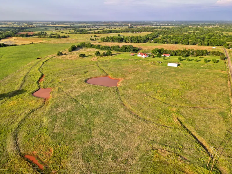 The property's extensive acreage includes five ponds, 80 +/- acres of prime farmland, and various outbuildings, including a poultry shed (20'x15'), a toolshed (20'x30') with a water well and three bays, an equipment shed (60'x25'), and a hay barn (60'x80'). Utilities include well water, city water with a check valve, two hot water heaters, and two electric panels. Additional supplies, such as Spanish steel roofing shingles and roofing repair materials, are included. 9 platted lots exist along the eastern boundary of the property along Santa Fe Avenue. This property is an exceptional opportunity for those looking to create their dream home while enjoying vast agricultural potential and serene natural surroundings.