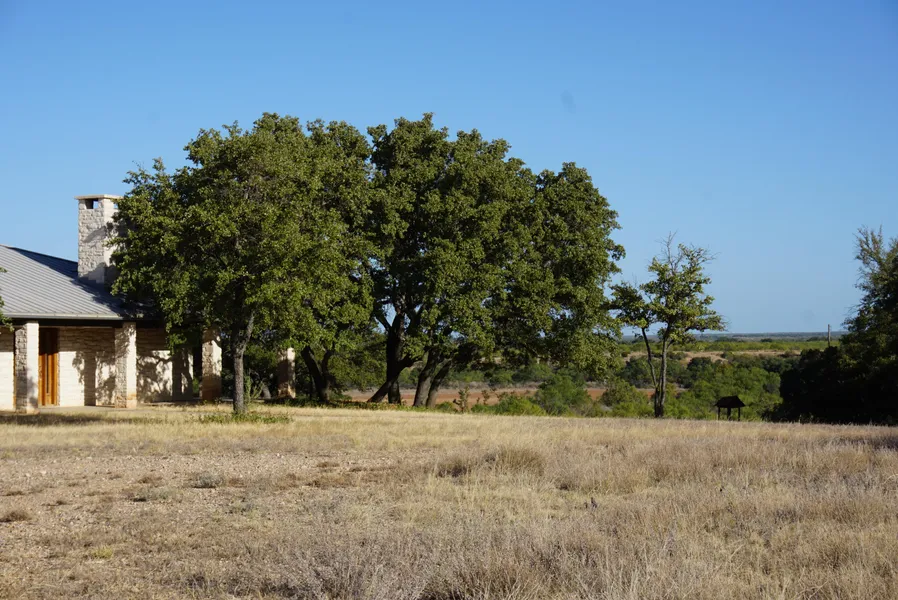 As mentioned, the house is Austin Stone and the roof, metal. In true Texas style, this home has covered porches on all four side. From the back porch you can look across the river with miles of beautiful countryside views. There are water rights from the river that may be included. Native Oak trees around the home provide shade and cover for the wildlife.