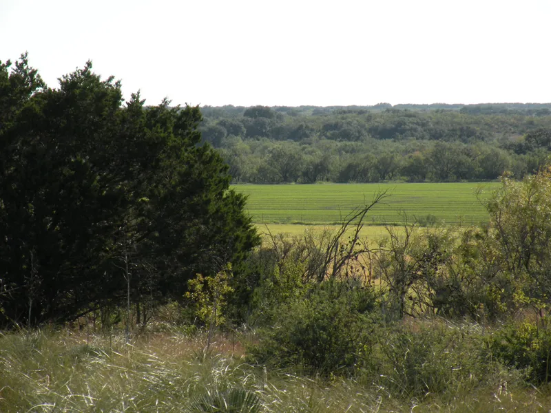 Terrain.The terrain is gently sloping from the front to the back of the place. It has nice pastoral views to the south and west, and the adjoining properties are well-kept farms and ranches. A seasonal waterway carries runoff water and supplies the 2 stock tanks. It is well wooded with mesquite and oak trees along the waterway, providing good game cover. The balance of it has yucca, sacahuista, and bluestem grasses.