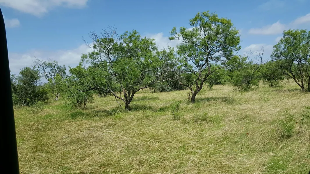 Large Oak and mesquite cover, wide draw(Calf Creek), 2 wells, hunting cabin, small metal barn.