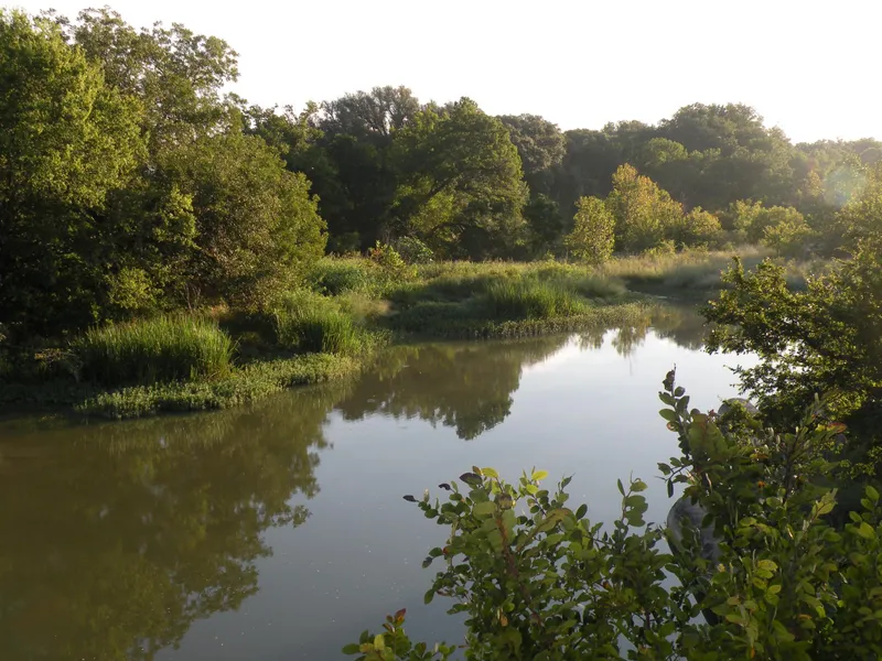 Below the meadow are the large pecan and elm trees along the river. It is very pretty there, shady and inviting. Then you have the riverfront. The river ripples and gurgles and makes a ver...