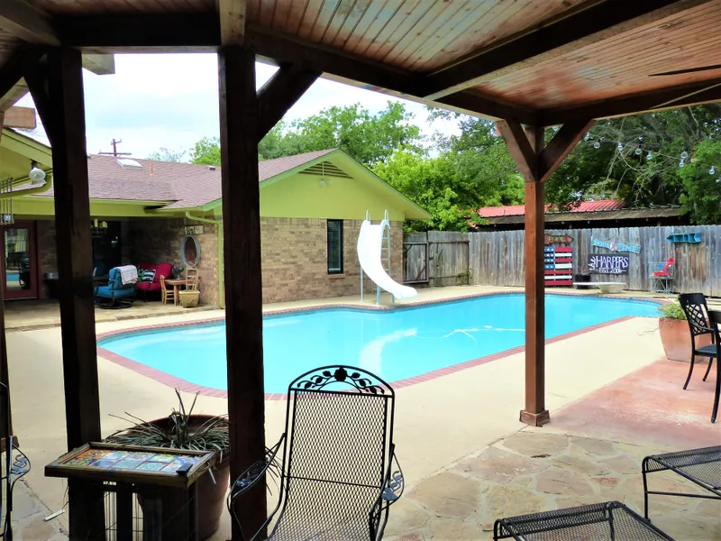 The backyard features a patio that is a combination of stained concrete, rock, and slip resistant surface all centered on a swimming pool complete with diving board and slide. The patio also has a bar area and a covered lounge area with a gas fire pit. The backyard also has privacy fencing, access to Wall Street, and a storage building/shop with A/C.