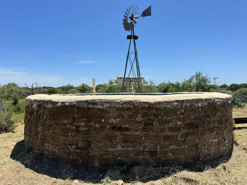 The property includes a water well, an old windmill, and a large cement water storage tank. The water well has recently been converted to a solar-powered system featuring a new pump and four solar panels.