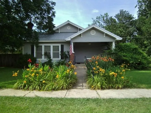 Check out this charming older home with hardwood floors, lots of built ins and high ceilings located in town near the school. Plenty of living area with over 2000 sf and 4 bedrooms. Living room features a rock fireplace w/wood stove and built in book shelves. Dining room has great lighting from the large windows which also has built in storage & pocket doors. There's no lack of cabinet or counter top space in the kitchen. Ceramic tile counter tops, large sink & glass top stove. Master has its own full bath & large closet. Bedrooms 2,3, & 4 all have built in desk/vanity and large closets. Full size laundry room with storage closet, shelves & cabinets. Covered front & back porch with an enclosed bonus/sun room. The yard has wonderful St Augustine grass with beautiful plants & flowers. Privacy fenced back yard with small shed and sidewalk leading to a detached metal one car garage with concrete floor & attached shed for more covered parking. Chain link Entry gates on either side of garage. Home sits on 3 city lots which is .29 acres. This Spacious home is selling AS IS!