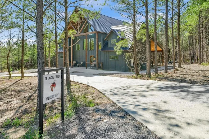 WHEEL CHAIR FRIENDLY CABIN - ATV TRAILS ARE LOCATED IN THE NEIGHBORHOOD Welcome to Jacket s Nest, a spacious farmhouse-style cabin located in the desirable Boulder Ridge development near Hochatown. With vaulted ceilings, open-concept living, & towering walls of windows connecting you to the beauty of the outdoors, this 2 master bedroom with an additional bunk bend sleeping area, 2 cabin luxury cabin has everything you need for an unforgettable stay. Spend starry evenings sharing stories around the fire pit or enjoy your book while unwinding in the hot tub. Explore endless opportunities for entertainment & relaxation. Jacket s Nest was thoughtfully designed to be a rejuvenating retreat in the woods. You can spend the entire weekend just hiding away in its comforting embrace but for times when you want to explore and be social, amazing nearby attractions are just minutes away. You will be sure to enjoy the large hot tub with private forest views! This home was designed for wheelchair accessibility. We've installed a concrete ramp, flat space for loading and unloading, cement driveway and sidewalks, roll in shower, open floor plan, and a flat area around the firepit to name a few. We also have wide door frames throughout the home.
