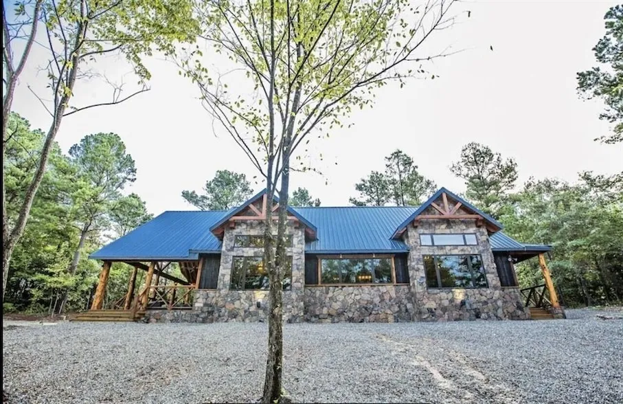 This 2-bedroom, 2.5-bath cabin boasts a unique rustic/modern design with approximately 1,632 square feet of thoughtfully planned living space. One of the highlights of the property is its wrap-around deck, complete with a hot tub, outdoor kitchen area, and dining space perfect for extending your living area and fully immersing yourself in the natural beauty of Hochatown, OK. The expansive deck creates an ideal setting for relaxing, entertaining, and dining al fresco while enjoying the serene surroundings. Situated on 1.03 acres, this cabin offers both privacy and convenience, being within walking distance of several local businesses and activities, making it easy to enjoy a peaceful, fun-filled vacation. Whether you're soaking in the hot tub, grilling outdoors, or exploring the nearby attractions, this cabin provides a perfect blend of relaxation and adventure.